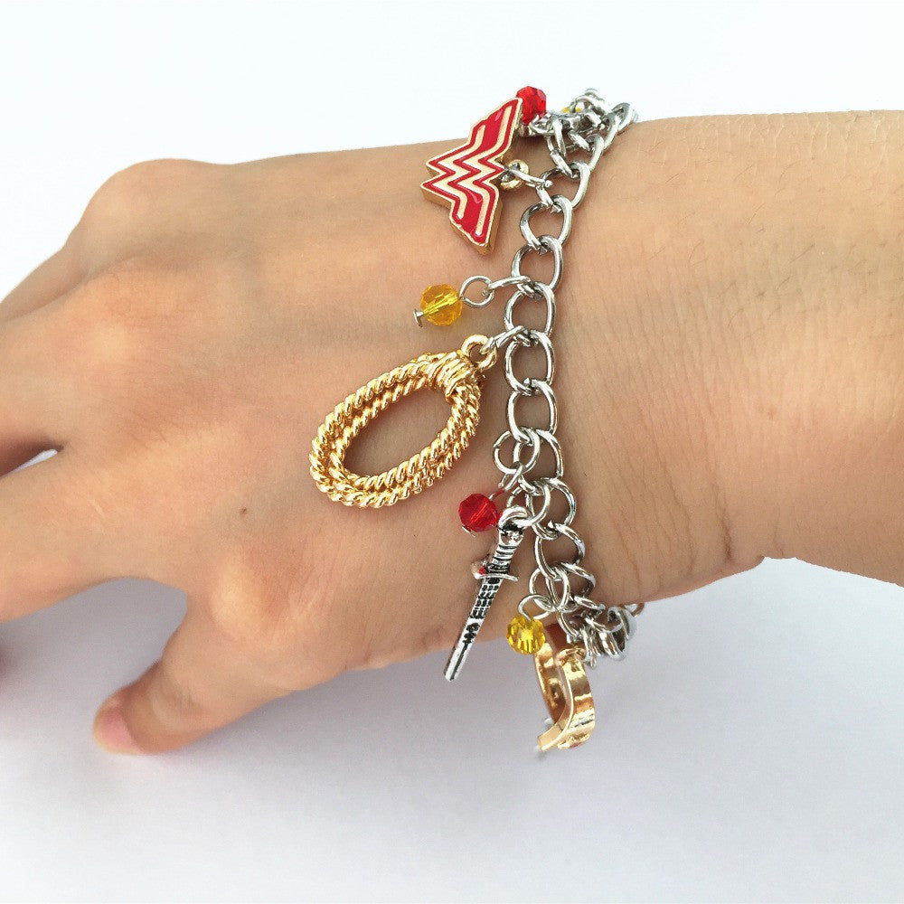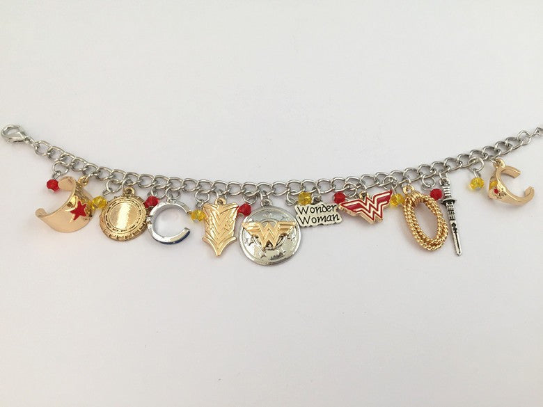 • Bracelet features 10 different Wonder Woman themed charms and colored beads.