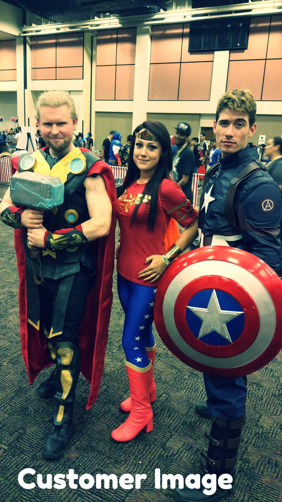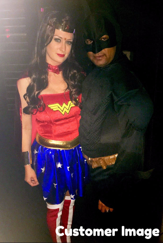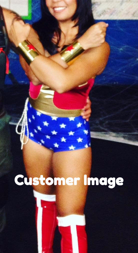 • Comes in a set of two, these cuffs feature a red star on the top and resemble the cuffs of Wonder Woman.